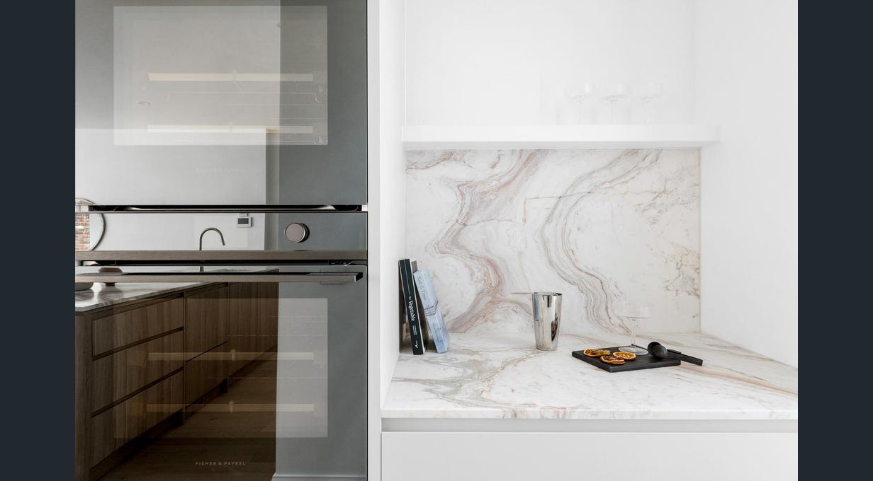 The result is a contemporary kitchen that balances form and function, tailored to the client's lifestyle and preferences.
